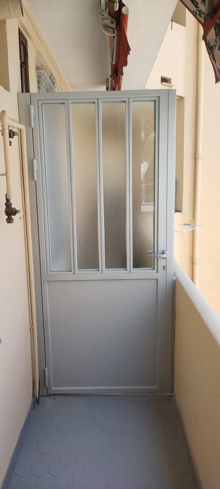 Aluminium Eric Serrurerie, entreprise spécialiste des fermetures sur mesure a fabriqué pour un de ses clients cette porte sur mesure en acier avec vitrage sécurit d'une épaisseur de 44,2mm en guise de séparation de cette terrasse.